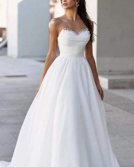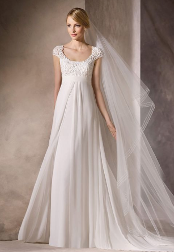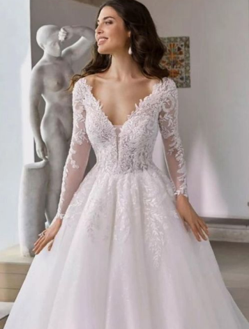 Este tipo de corte es similar al corte de princesa, pero la diferencia es que el corte “A” tiene menos volumen y desde la cintura hasta los pies, se abre una línea con forma de “A”. De hecho, este estilo es ideal para todo tipo de figura, sin embargo, es uno de los más recomendados para las novias con cuerpo de triángulo invertido.