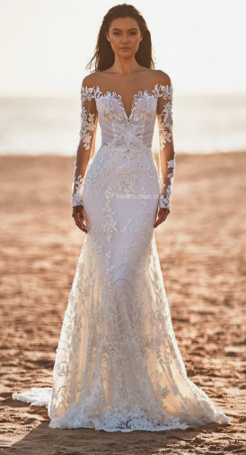 Se conoce por su hermoso corte de sirena, espalda baja y escote que te permitirá lucir más hermosa que nunca. Su pedrería le da ese toque elegante que deslumbra y en caso de que prefieras las colas no tan largas, la cola de este vestido es lo suficientemente discreta.