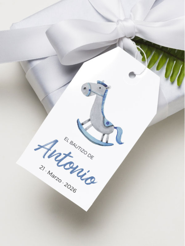 Personaliza tus detalles de bautizo con estas etiquetas de diseño de caballito. Un toque único y encantador para decorar regalos y recuerdos.