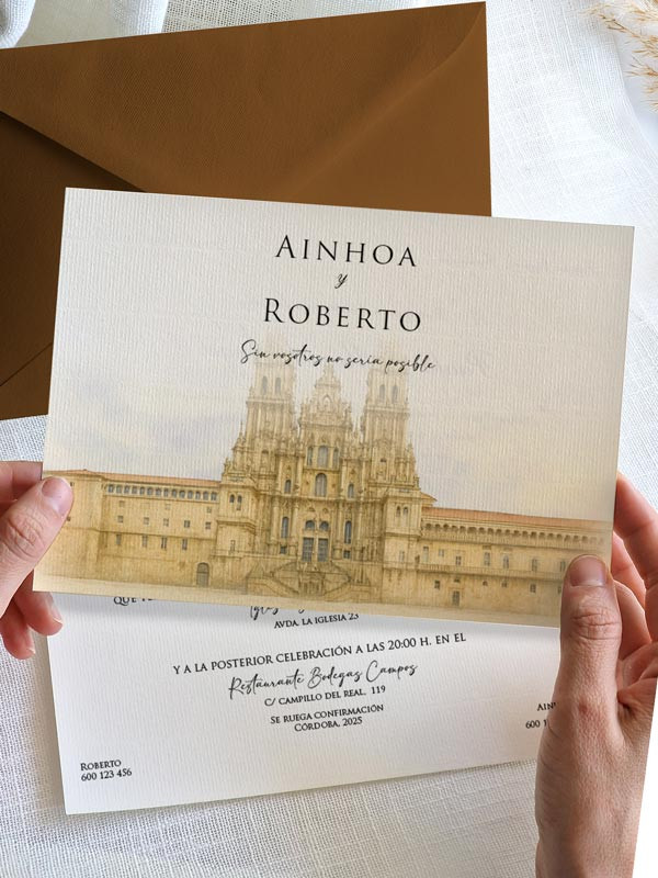 Invitación acuarela boda papel Catedral de Santiago de Compostela