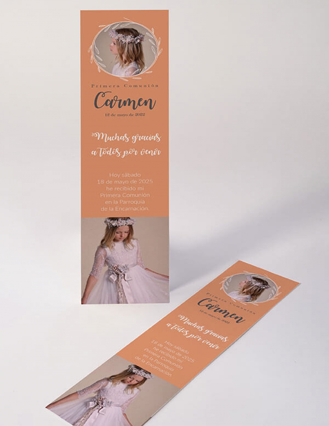 Marcapáginas originales personalizados con todos los datos personalizados de la Primera Comunión en formato punto de libro.